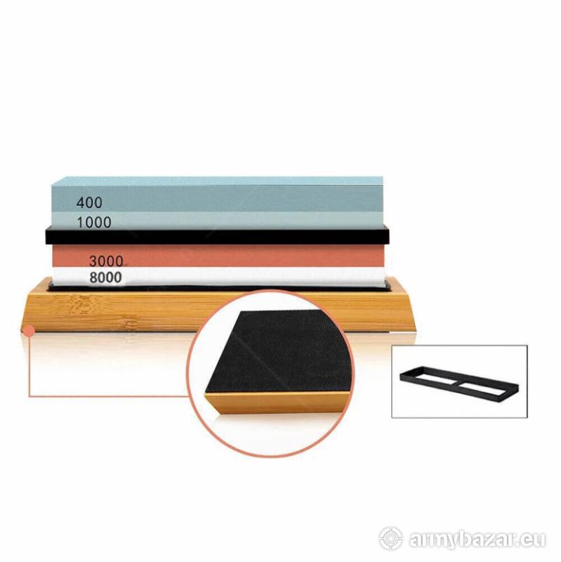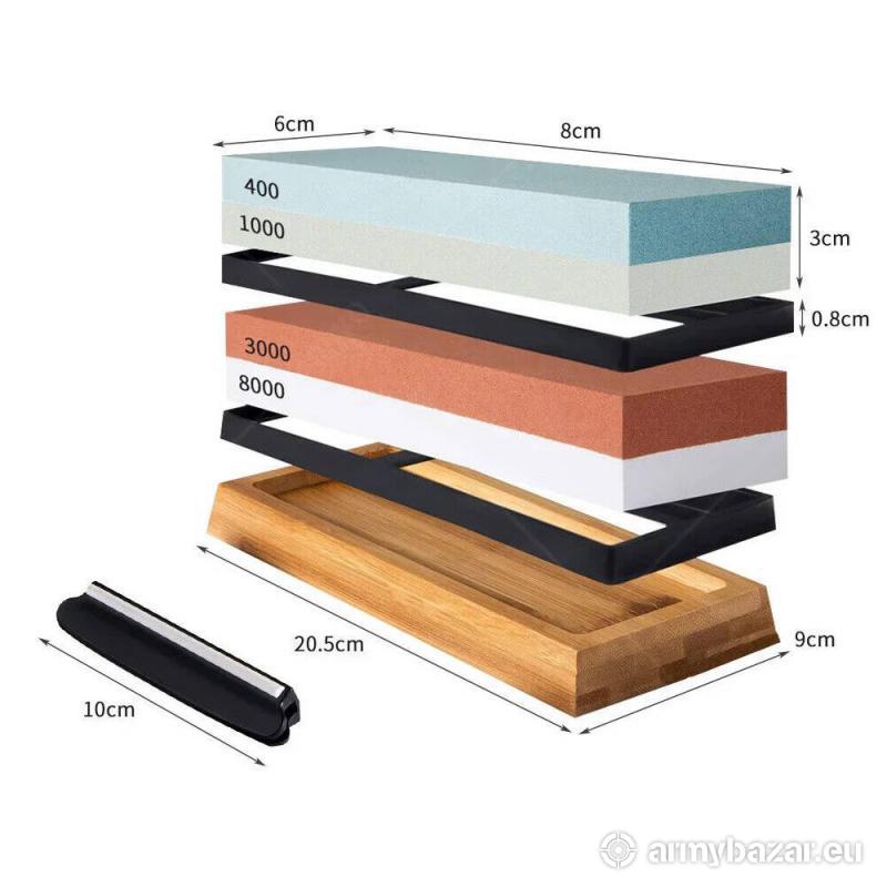 Popis: Sada pro přesné broušení nožů, dva oboustranné kameny s gradací 400/1000 a 3000/8000 s bambusovým stojánkem a rukojetí, která usnadní správné držení výrobku Rozměry: brusný kámen #400/1000: 18 x 6 x 3cm, hmotnost 660 g brusný kámen #3000/8000: 18 x 6 x 3cm, hmotnost 670 g zplošťovací kámen: 6 x 2,5 x 2,5 cm, hmotnost 90 g bambusová základna: 21,5 x 9,2 x 2,3 cm Zakoupíte v obchodě Armik na adrese Tyršova 271, Žatec nebo online na https://armik.cz/brusny-kamen-zrnitost-400-1000-3000-8000/. Možné je i vyzvednutí v nonstop fungujícím výdejním boxu ArmikBox nebo zaslání kamkoliv v ČR.
